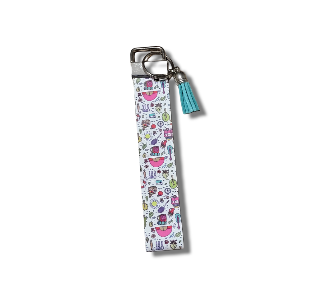 Beautiful 1" width Happy Camper leather wristlet with a Aqua Blue coordinating vinyl. Wristlets come in 3 different sizes, we pick a cute charm or tassel for you.