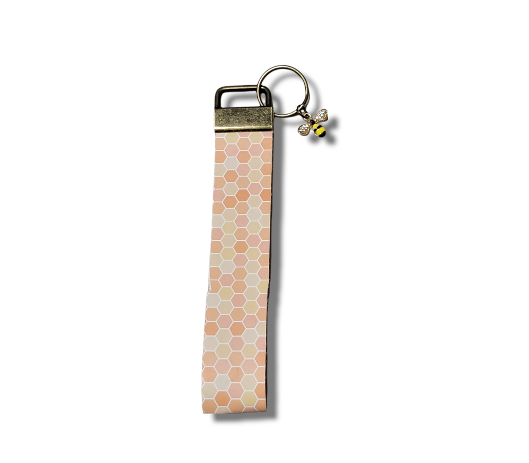 Beautiful 1" width Honeycomb print vegan leather wristlet with coordinating vinyl. Wristlets come with Gun metal hardware color and a coordinating cute bee charm .