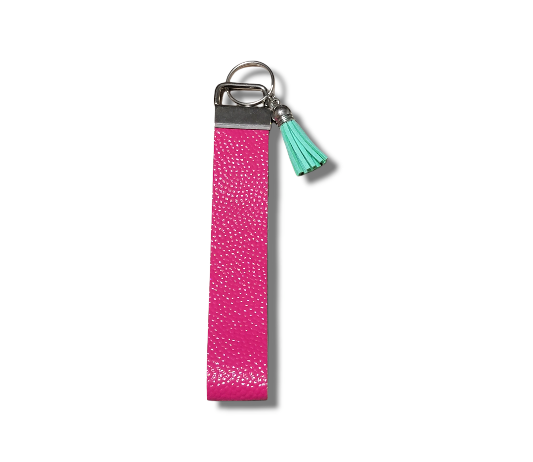 Beautiful 1" width Hot Pink-Mint vegan leather wristlet with Mint coordinating vinyl. Wristlets come in 3 different sizes, we pick a cute charm or tassel for you.