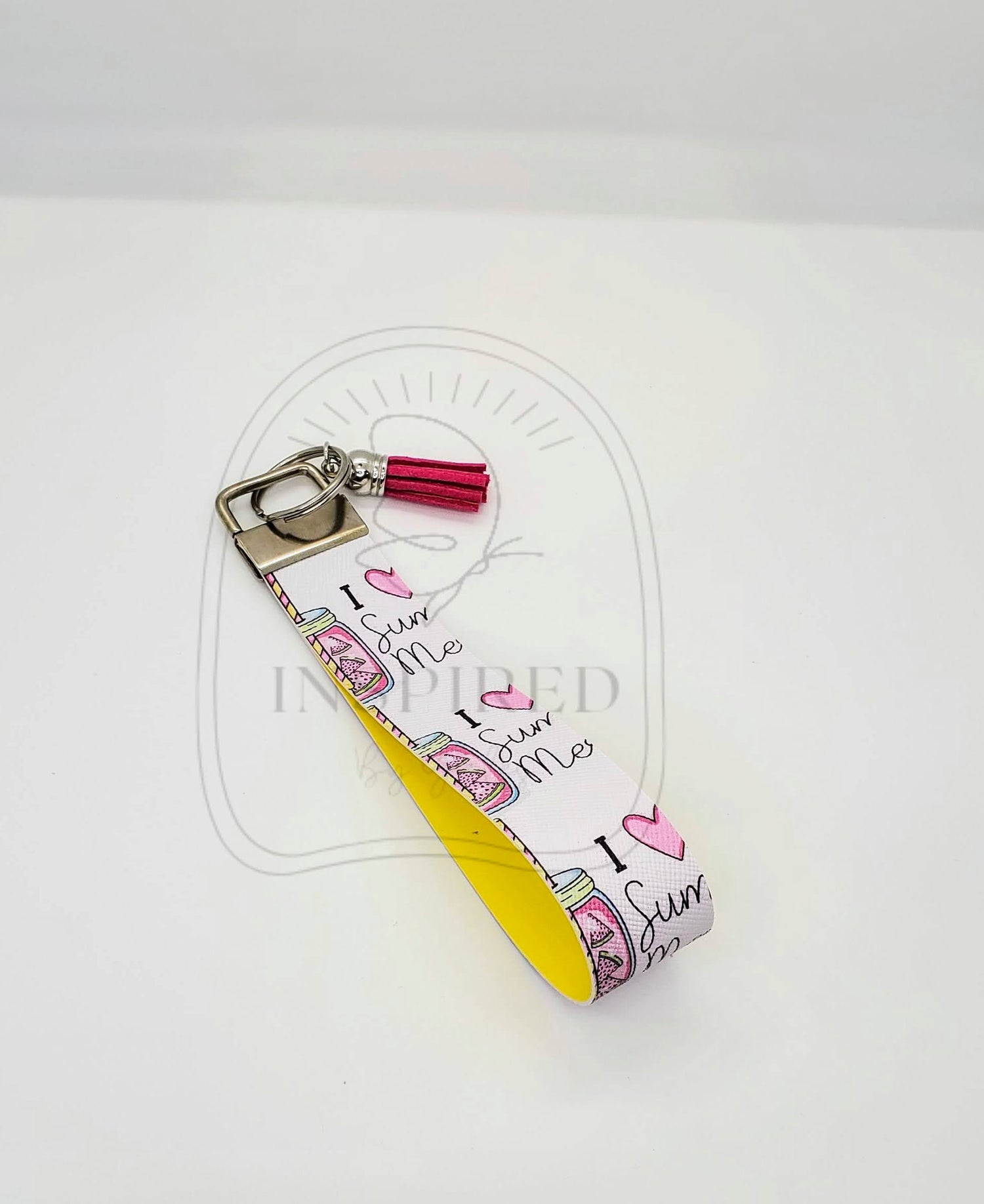 Beautiful 1" width I LOVE SUMMER vegan leather wristlet with coordinating vinyl. Wristlets come with a Silver hardware color and a coordinating cute charm or tassel .