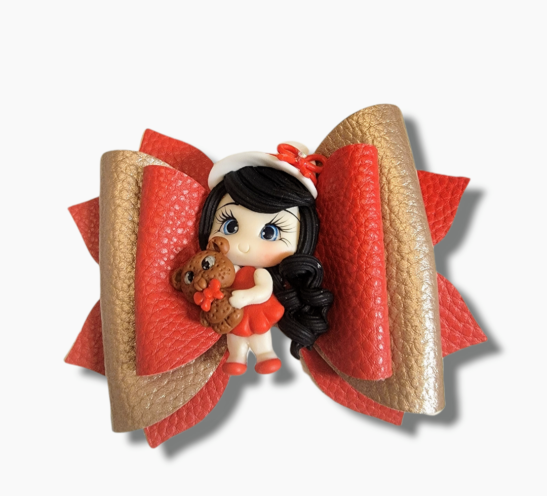 Beautiful soft Red & Metallic Gold Faux Leather Jasmine Bow with clay doll with teddy with