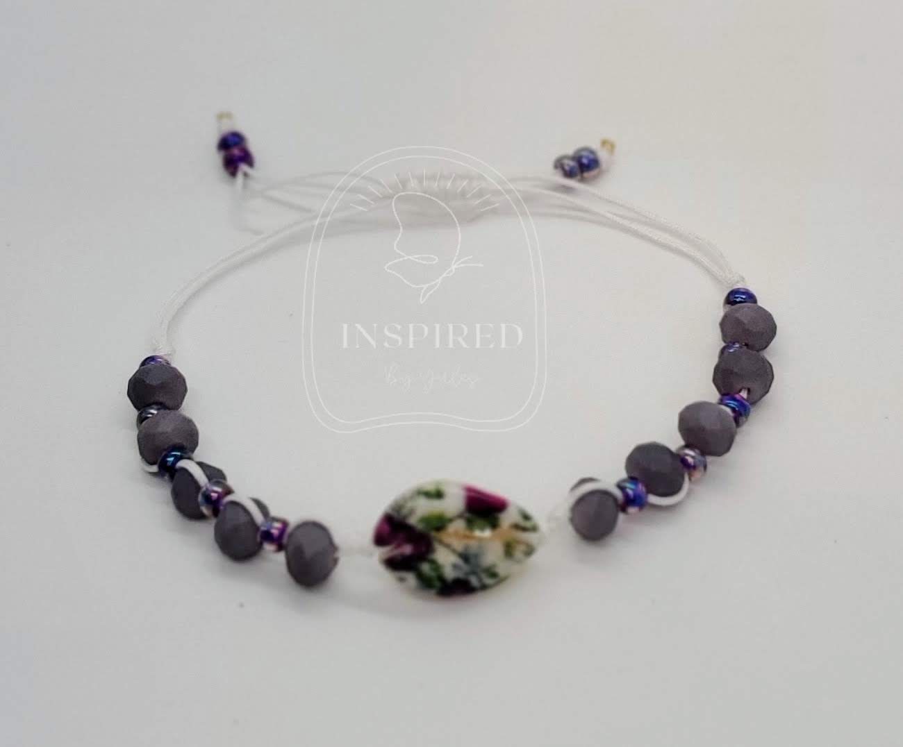 Delicate hand painted purple floral adjustable bracelet with matte crystals.
